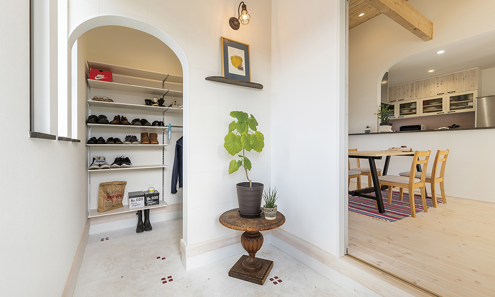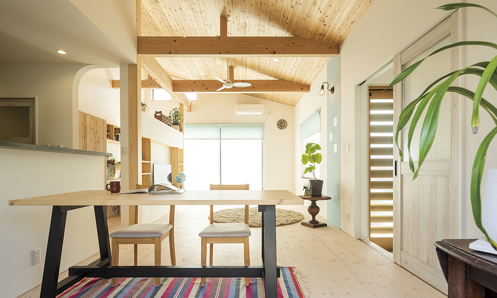 「昔ながらのどっしりとした家にしたい」というご要望を受け、赤城山の丸太を主軸に、大理石や石灰といった落ち着いた雰囲気の建材を使用しました。採光や開放感が印象的な、自然と笑みがこぼれる空間になりました。